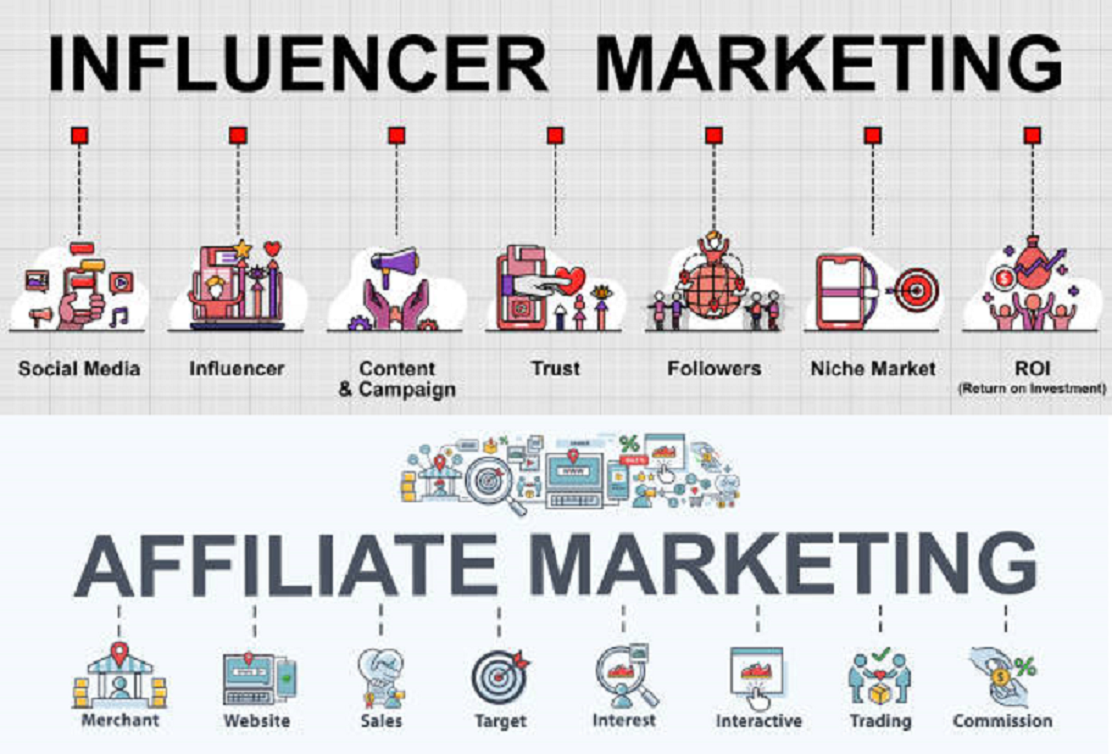 Affiliate marketers (Affiliates) are third-party marketers who promote and sell your products.   Influencer marketers (Influencers) are influential personalities on social media who are chosen to promote your products.